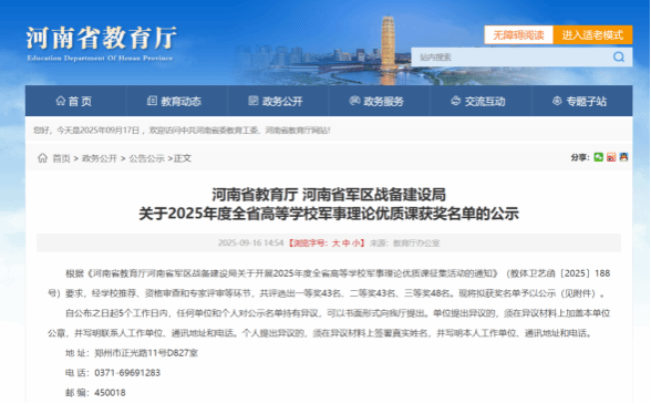 我校军事理论课程荣获2025年全省高等学校军事理论优质课二等奖近日,河南省教育厅公布2025年度全省高等学校军事理论优质课获奖名单,我校选送袁进展老师的《信息化装备和信息化作战平台(一)》、李晓梅老师的《...